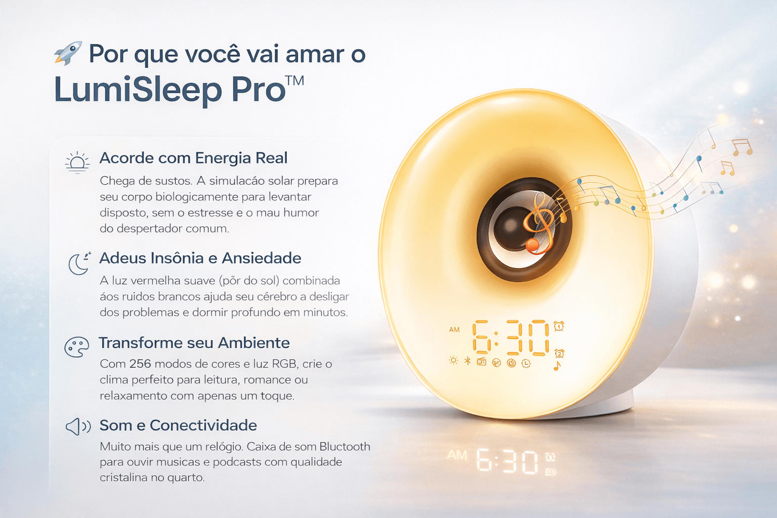 Diga adeus ao susto do despertador tradicional. O LumiSleep Pro™ usa a Bio-Iluminação para te acordar de forma natural, recarregando seu corpo e sua mente.