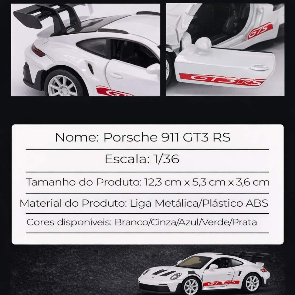 A miniatura do carro esportivo e luxuoso Porsche 911 GT3 RS é mais do que um simples objeto de coleção - é uma representação fiel de um dos carros de corrida mais icônicos da Porsche. Seja para decorar sua prateleira, presentear alguém especial ou simplesmente apreciar a beleza dos detalhes, este modelo é uma escolha excepcional. Adicione essa peça única à sua coleção e experimente a paixão pelos carros de corrida em uma escala miniatura inigualável.