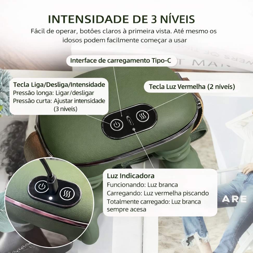 Ele combina tecnologia de massagem 4D, movimentos de amassamento profundo e aquecimento terapêutico, proporcionando uma experiência muito próxima à de uma massagem profissional, sem sair de casa.