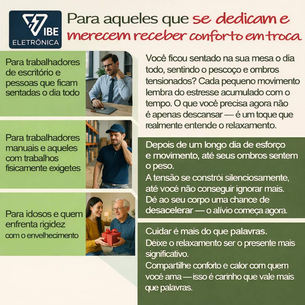 Ideal para quem sofre com tensão cervical, dores lombares ou ombros travados.