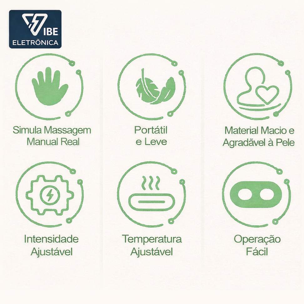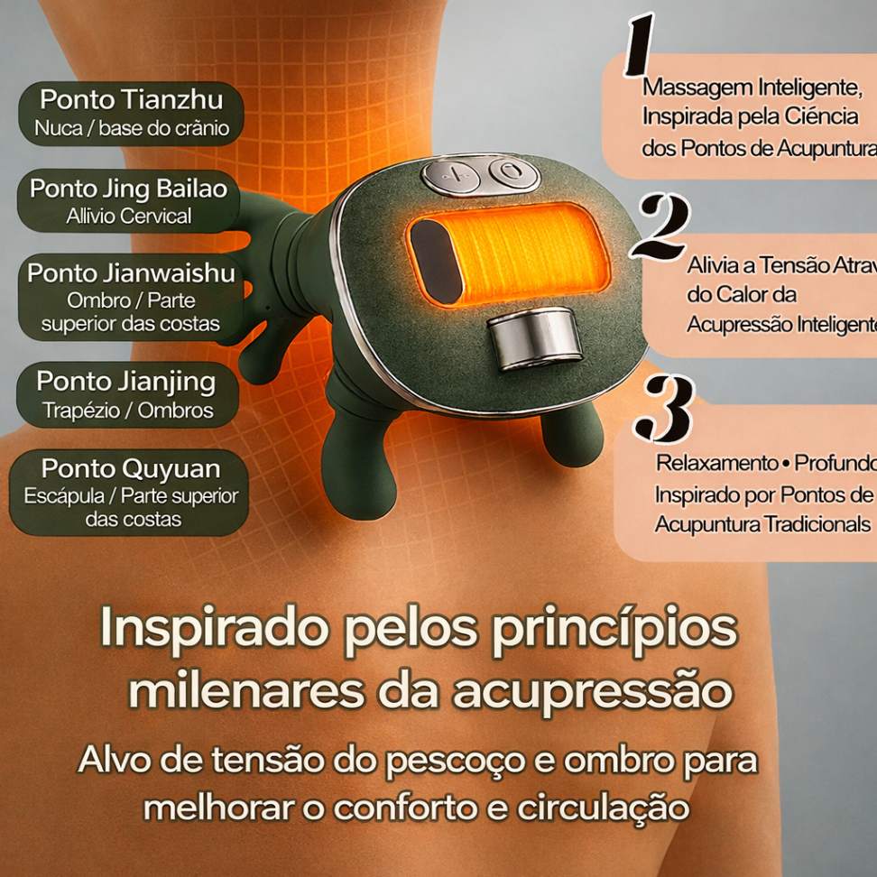 Esse não é um massageador comum. Ele simula o amassamento manual de uma massagem profissional, alcançando as camadas profundas do músculo onde a dor realmente começa.