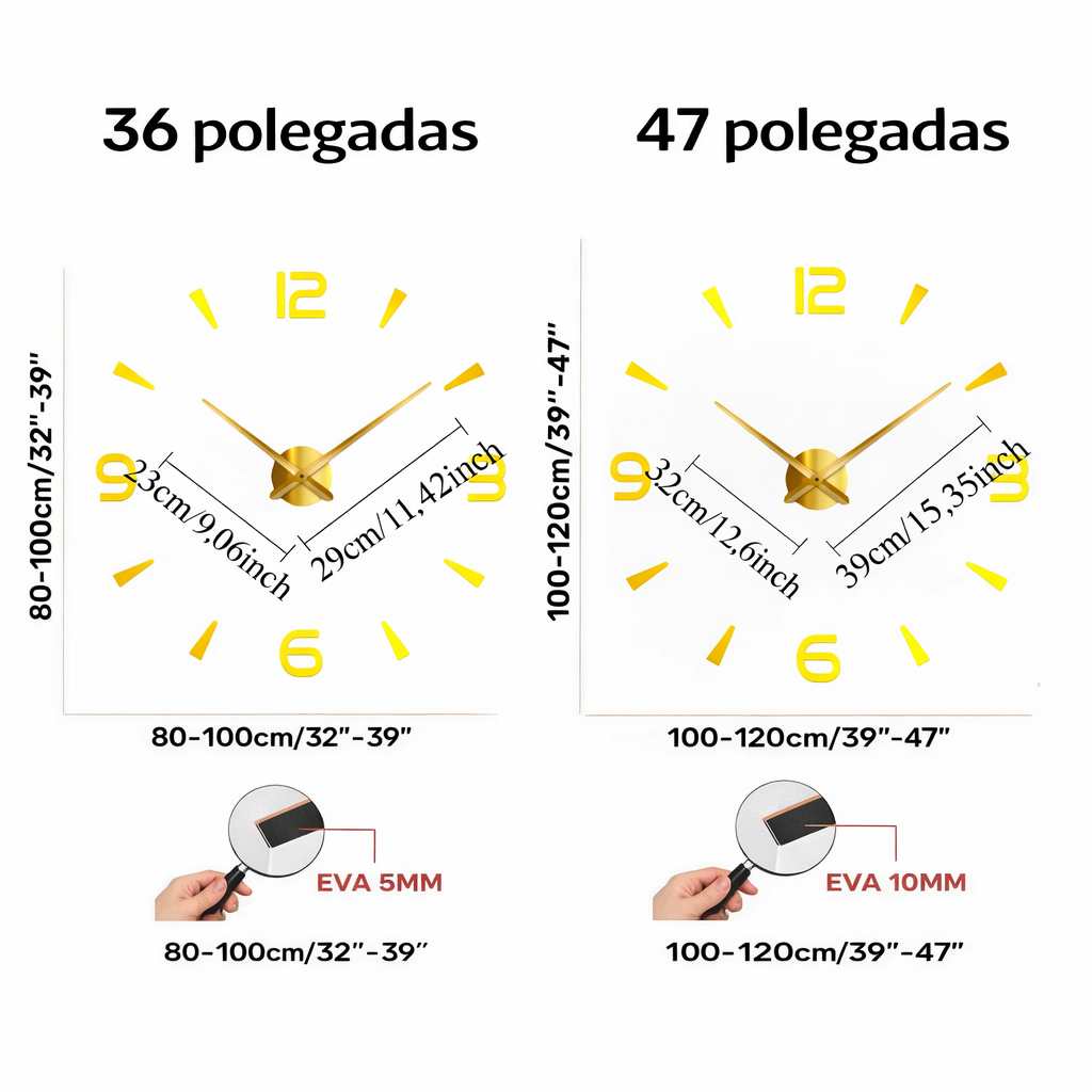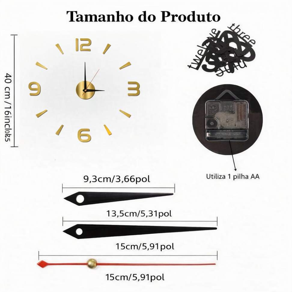 O modelo de 40 cm não possui efeito 3D profundo. Os ponteiros possuem cor preta (não dourado ou prata).