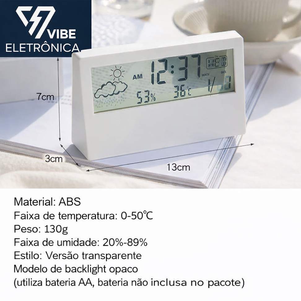 Material: ABSnFaixa de temperatura: 0-50℃nFaixa de umidade: 20% -89%nTipo de exibição: DigitalnDesign e estilo: Transparente e opaco, com luz de fundonPeso: 130gnnn|Relógio Com Termometro|Relógio Termometro|nn**Exibição de Clima Transparente** n n O Relógio com Termômetro e Higrômetro LCD Transparente é uma adição elegante e funcional para qualquer ambiente doméstico. Este dispositivo de última geração apresenta a exibição digital clara que apresenta uma temperatura, umidade e uma data, além de um relógio de alarme. Com seu design moderno e material ABS, este relógio não apenas serve como uma ferramenta de medição, mas também como um elemento decorativo que complementa qualquer decoração de casa. Seu design transparente e opaco, com luz de fundo, garante que o dispositivo seja visível e legível em diversos ambientes, seja durante o dia ou à noite. n n **Funcionalidade Integrada de Clima** n n Este relógio com termômetro não é apenas um simples relógio; é uma estação meteorológica que fornece informações sobre o clímax interno. Ele possui a função de alarme para acordar você de forma suave, enquanto o display de símbolos meteorológicos (sol, nuvens, chuva) fornece uma previsão do tempo em tempo real. Uma faixa de temperatura de 0-50 ℃ e a faixa de umidade de 20% -89% garantem que você tenha uma visão completa do clímax em seu ambiente. n n **Design Versátil e Operação Fácil** n n Com um design transparente e opaco, este relógio com termômetro oferece duas opções de visualização, atendendo a preferências individuais. O peso leve de 130g garante que ele possa ser facilmente movido de lugar para lugar, tornando-o uma estação meteorológica versátil para qualquer ambiente. Embora este dispositivo não seja um dispositivo inteligente e não necessite de bateria, ele é alimentado por baterias AAA que não são incluídas no pacote. Para uma visualização de noturna, uma versão opaca possui uma função de luz de fundo, enquanto uma versão transparente não possui esta característica. n n **Uso e Manutenção** n n Para garantir que o relógio funcione como esperado, é importante remover o filme protetor da tela antes do uso. Este relógio com termômetro é projetado para ser fácil de usar e manter, tornando-o uma escolha ideal para quem busca um dispositivo confiável e estiloso para monitorar o clímax em casa.