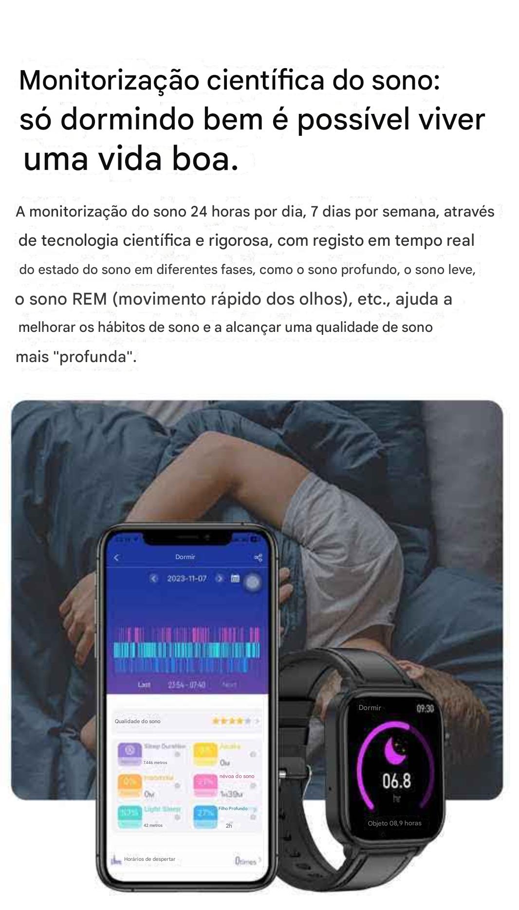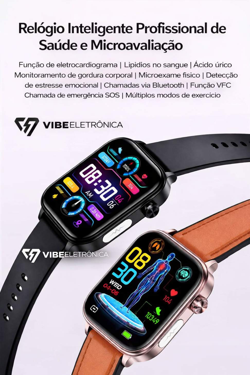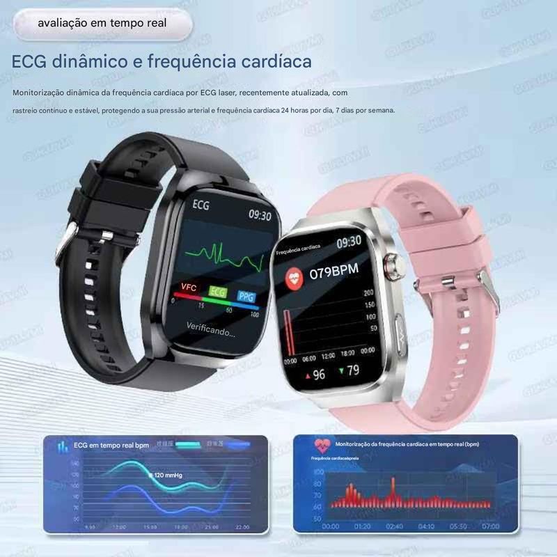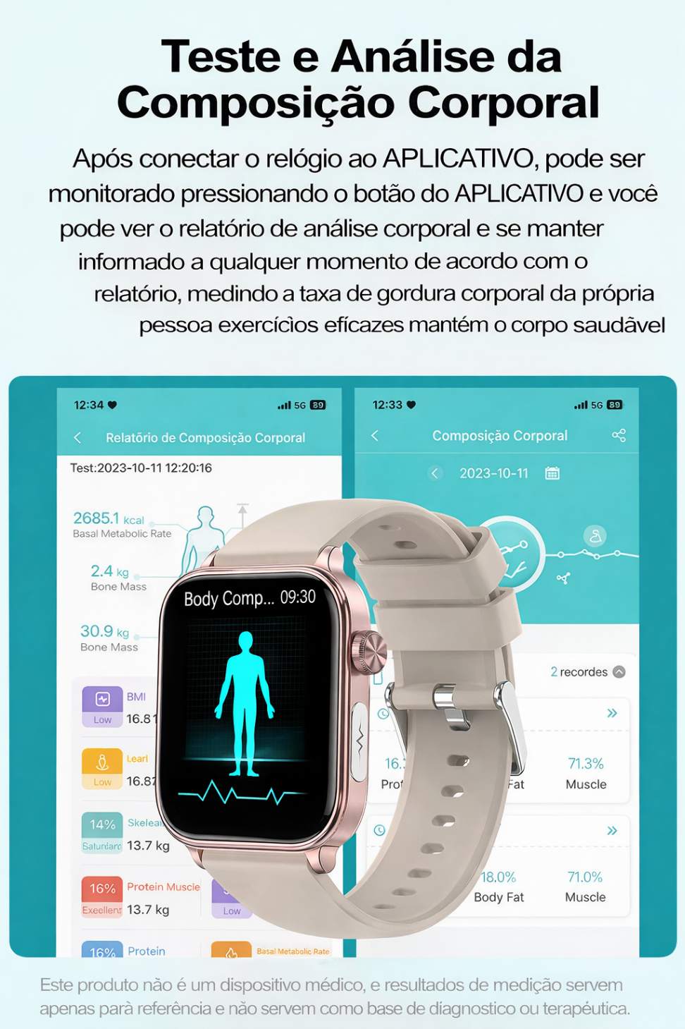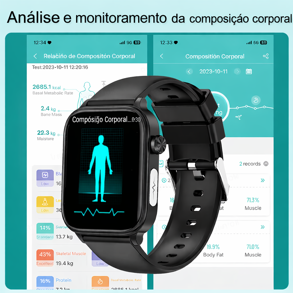 ✔ Monitoramento Completo de Saúde: Monitoramento de sono, estresse, Glicose (não invasiva), Lipídios (colesterol, triglicerídeos), Ácido Úrico, Composição Corporal, ECG (Eletrocardiograma), PPG (Fotopletismografia para batimentos e oxigênio), Pressão Arterial (PA), Oxigênio no Sangue (SpO2).