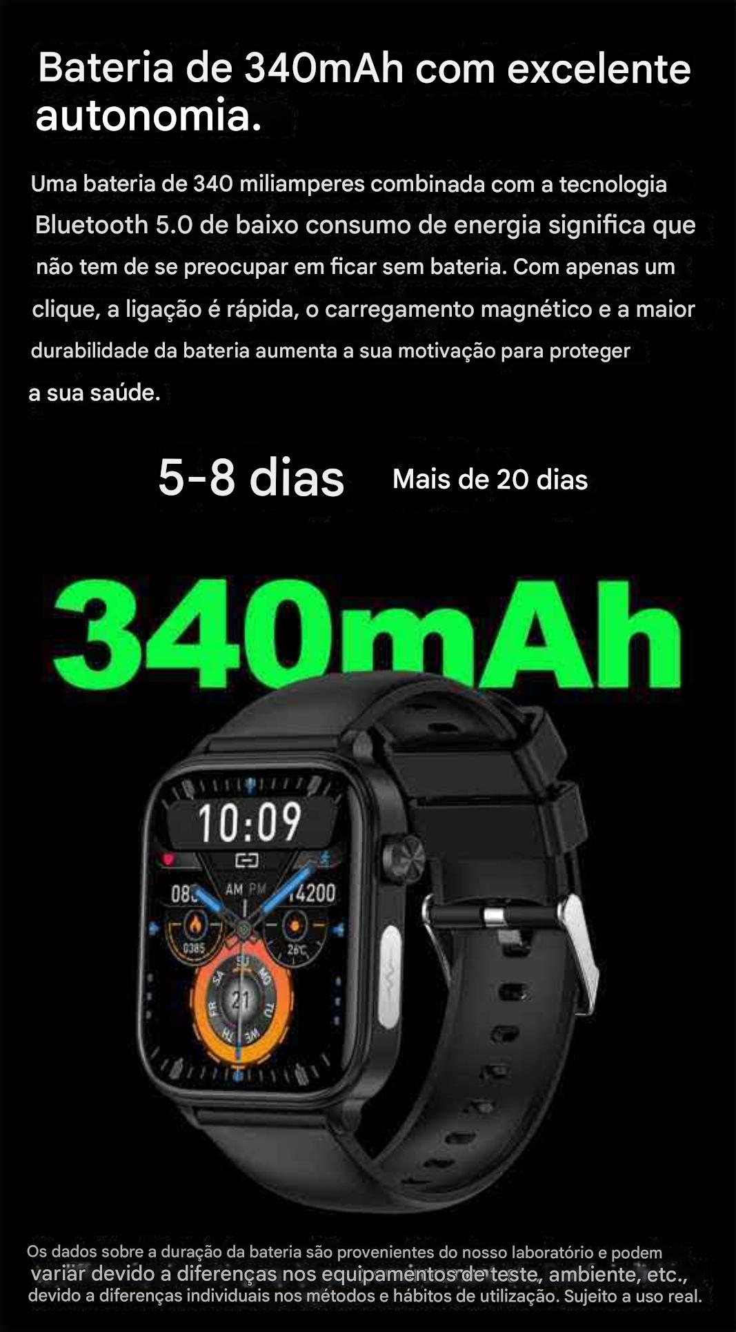Capacidade da bateria | 300–450 mAh (340 mAh) | Excelente autonomia diária |